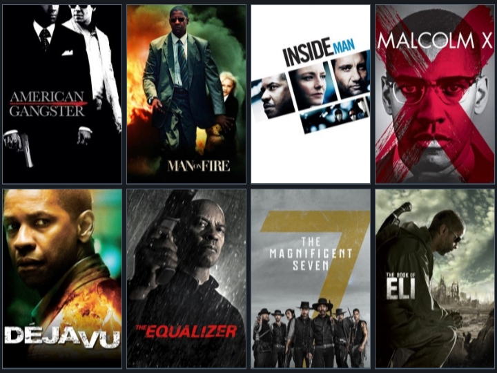 Denzel telah membintangi 50 judul film, termasuk film aksi, drama, kriminal, biopik, thriller, hingga fiksi ilmiah. Bahkan tiga di antaranya disutradari oleh Denzel sendiri, yaitu Antwone Fisher, The Great Debaters, dan Fences. Film-film aksi terbaik, sebut saja: The Siege, Training Day, 2 Guns, The Equalizer, hingga The Magnificent Seven.